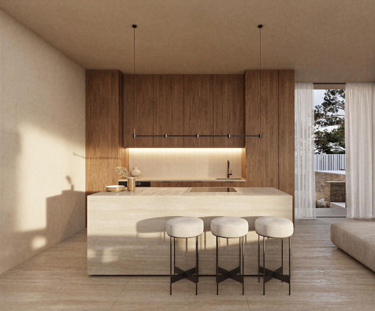 Arkitekturen blander middelhavsvarme med moderne eleganse og kombinerer naturstein, tre og myke, nøytrale farger, som integreres sømløst med kystlandskapet.